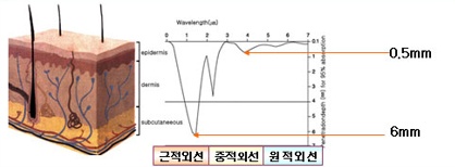 (생명선으로 각광받고 있던 원적외선이 피부 0.5 mm 까지 침투하여 겉피부만 자극하는 것에 비해 근적외선은 6 mm 깊이로 원적외선보다 12배 이상 깊이로 들어가 그 효과도 12배 이상이어서 요즈음 암치료에 적용되고 있다.)